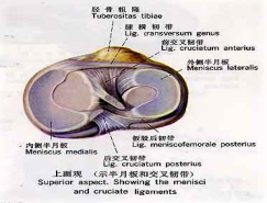 1.月牙狀纖維軟骨,填充在股骨與脛骨關(guān)節(jié)間隙內(nèi)。